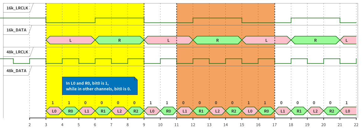 - As shown in the figure, due to the inability to achieve synchronous transmission, the receiving end may receive the data in the order of L1 L2 L0 or L2 L0 L1. To solve this problem, we can add markers to the data of each channel. First, we can set the last bit of L0 and R0 to 1, and the last bit of other channels (L1, L2, R1, R2) to 0. Loss of minimum 1 bit precision has virtually no impact on audio quality.