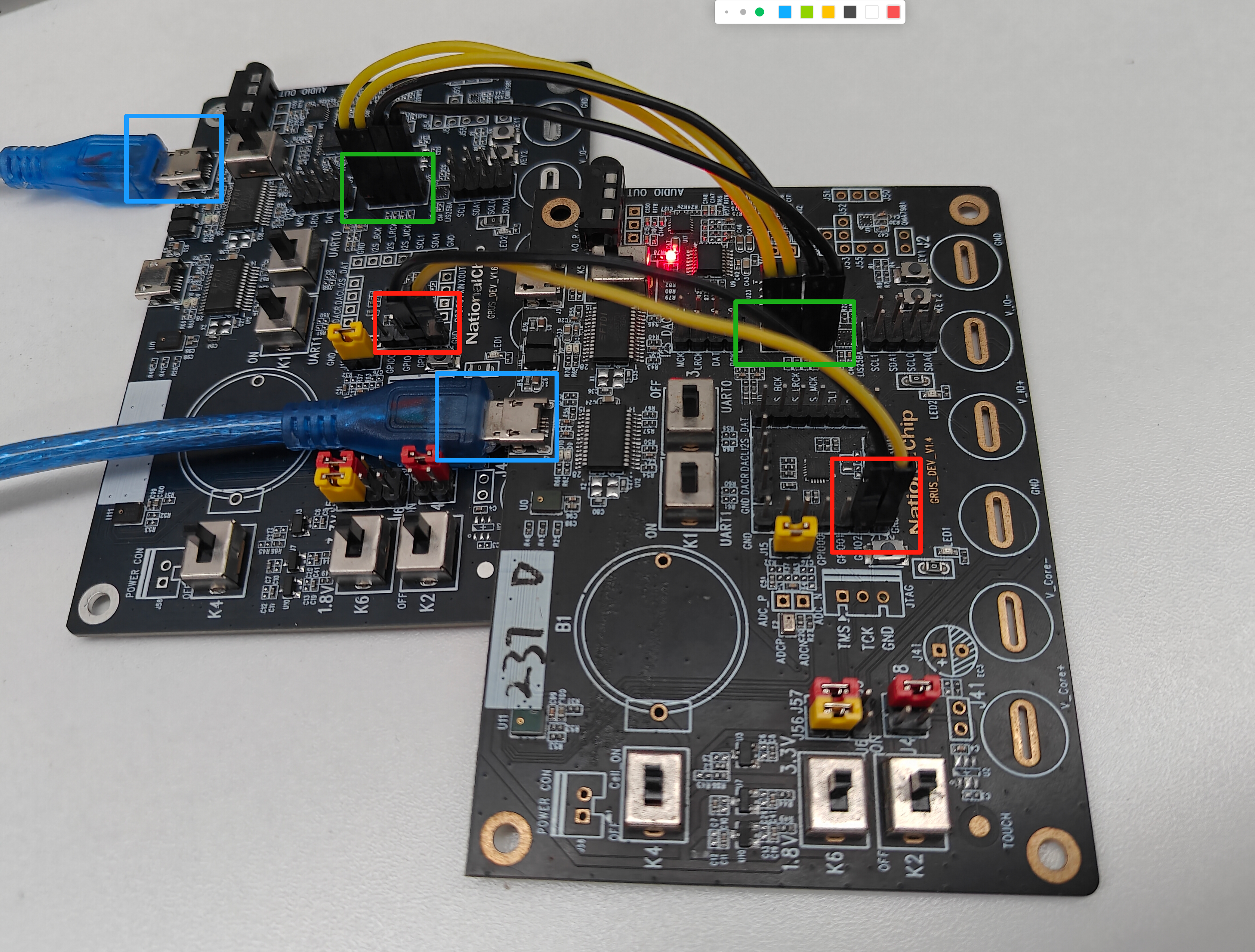 - 绿色框为spi管脚(注意要使用左边的排针),按照板子上的标注连接spi管脚即可,同时连接右下角的GND共地;